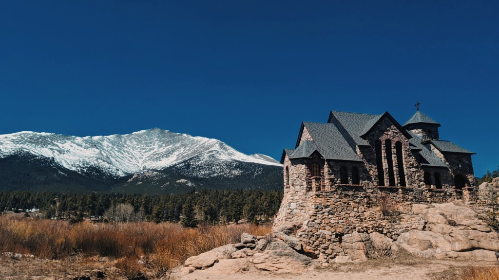 Un peu avant d’arriver à Estes Park, les surprises continuent le long de la route avec la fameuse Chapel on the Rock ou plus officiellement Saint Catherine of Siena Chapel. Cette église catholique est située sur le Camp Saint-Malo (les Malouins sont vraiment partout!) à presque 3000m d’altitude. En 1916, Monseigneur Joseph Bosetti découvre une grande formation rocheuse juste à l’est du Rocky Mountain National Park et inspiré par l’expression biblique « sur ce rocher je construirai mon église », il imagina une église construite sur le rocher. Son manque d’investissement a retardé la construction de près de 20 ans et il a eu du mal avec le Colorado Highway Department pour garder le rocher intact. Finalement, le terrain pour l’église a été donné par M. et Mme Oscar Malo. L’architecte d’origine française Jacques Benedict a conçu la chapelle, qui a été achevée en 1936. Consécration ultime en 1993 le Pape Jean Paul II a visité et bénit l’Église. Il a passé quelques jours au Camp Saint-Malo en retraite.