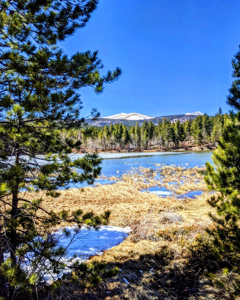 Pour se mettre en jambes, on débute par une petite rando au Mud Lake. Le lac n’est pas aussi boueux que son nom laisse penser. Avec les beaux jours (j’y étais en avril), le lac à commencé à dégeler et offre une belle couleur bleu glacial qui contraste avec la végétation des zones humides et les sapins. Le parc aux alentours de Mud Lake regorge d’animaux sauvages, dont des élans, malheureusement je n’en ai pas (encore) vu.