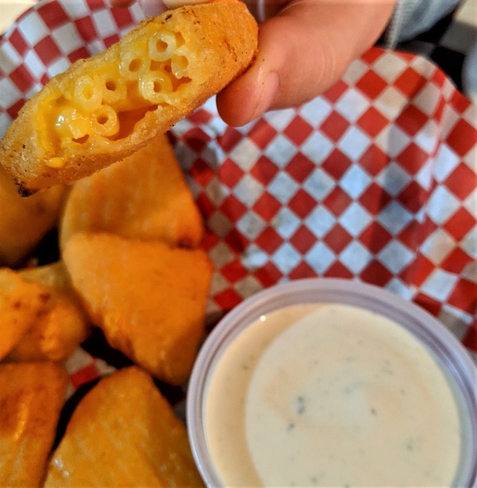 Les Macaroni and Cheese mieux connus ici sous le nom mac’n’ cheese sont un classique de la « comfort food » aux États-Unis. Les pâtes mélangés dans une sauce au fromage (souvent cheddar ou poudre de cheddar) peuvent être assaisonnées de bacon, piments jalapeños, homard, …mais aussi saupoudrées de chapelure et gratinées au four. Mais ca paraissait presque trop sain, il fallait donc trouver un moyen de les frire, comment? Faire des boulettes avec les mac’n’cheese, les baigner dans des œufs et de la chapelure et zou dans l’huile bouillante! Le résultat est assez étonnant mais le croustillant de la friture avec le côté fondant des pâtes au fromage est assez satisfaisant. C’est le genre de finger food qu’on trouve généralement dans les bistro ou les dinner